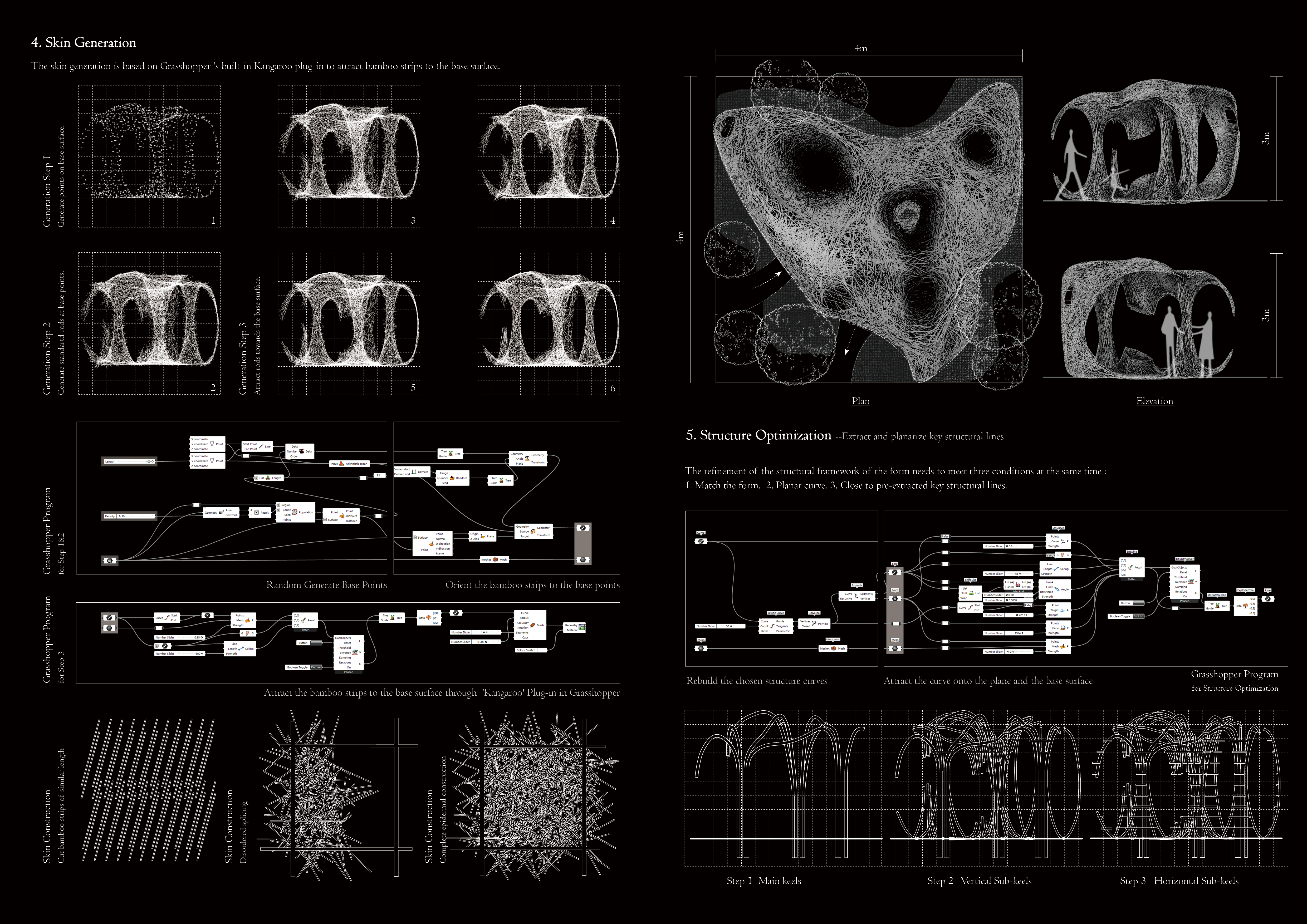 The design phase employed Kangaroo Grasshopper physics simulation engine for structural generation and optimization.Grasshopper was also used to create animations for model presentations and construction processing. During the construction phase, the parametric model generated detailed fabrication drawings for irregular bamboo poles and exported positioning data for complex joint connections, providing critical support for construction accuracy and assembly coordination.